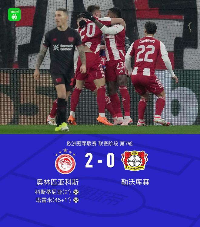 勒沃库森0-2客负奥林匹亚科斯,塔雷米、科斯蒂尼亚建功-360直播